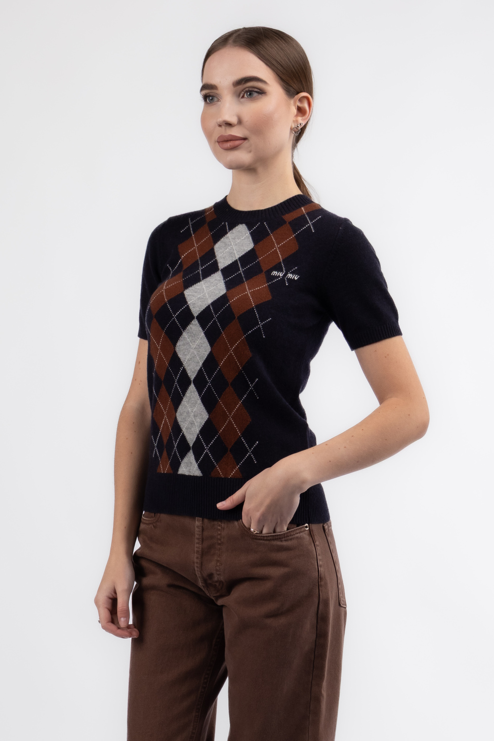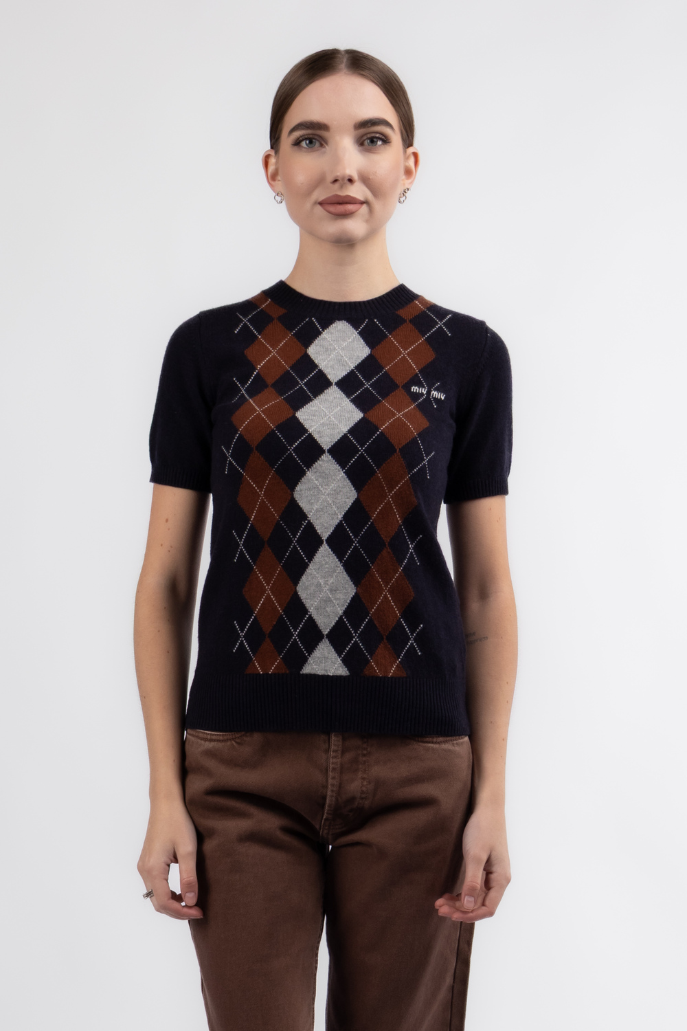 Стильна футболка з білим логотипом та ромбами на чорному фоні стане яскравим акцентом у вашому гардеробі. М’який кашемір додає виробу елегантності та комфорту, роблячи її ідеальною для повсякденного носіння або особливих випадків. Лаконічний дизайн поєднує класичну строгість і сучасний шарм, а чорний колір легко комбінується з джинсами, спідницями чи брюками. Купити як в Запоріжжі так і в Одесі легко — додайте цю футболку до свого образу і підкресліть власний стиль.
